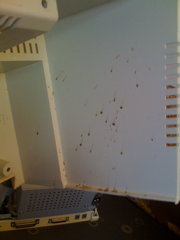 I see more of that brown goop on the side of the metal tray for the mainboard.
