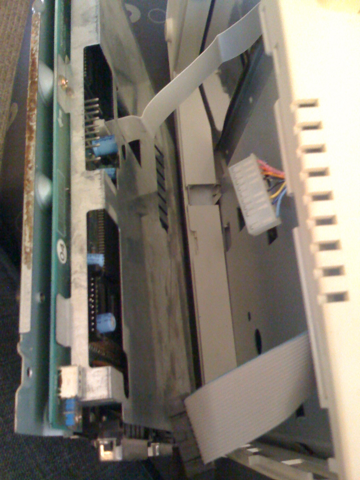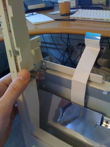 There are three ribbons connected to the mainboard – the power cable, floppy drive, and keyboard. Each one comes up fairly smoothly, though I take my time about it. I'm in no mood to bend a pin or snap any plastic!