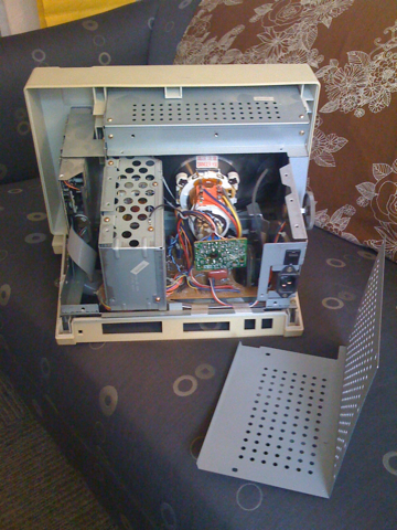 The CRT has to come free next, to allow the case to open fully. It's part of an assembly that I should be able to keep mostly intact. As it transpired, I removed the floppy drive, which wasn't really necessary.
