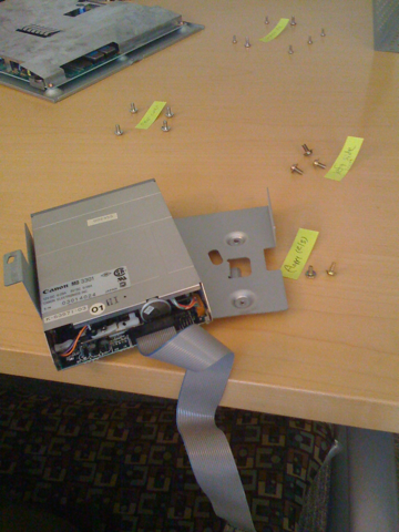 Floppy drive is now removed. Just three screws, it comes out in its sled.